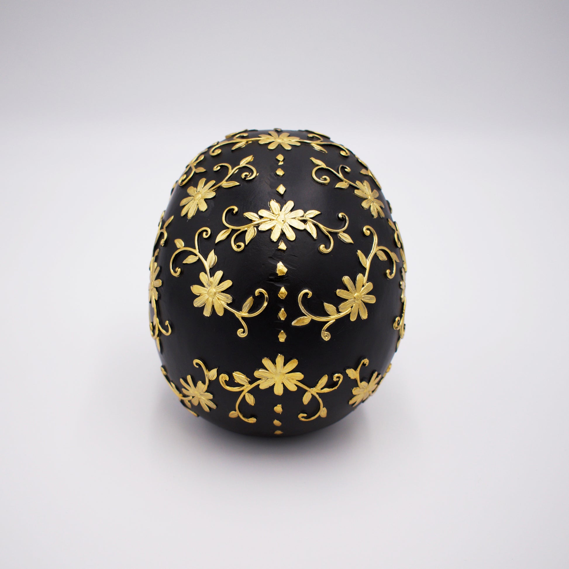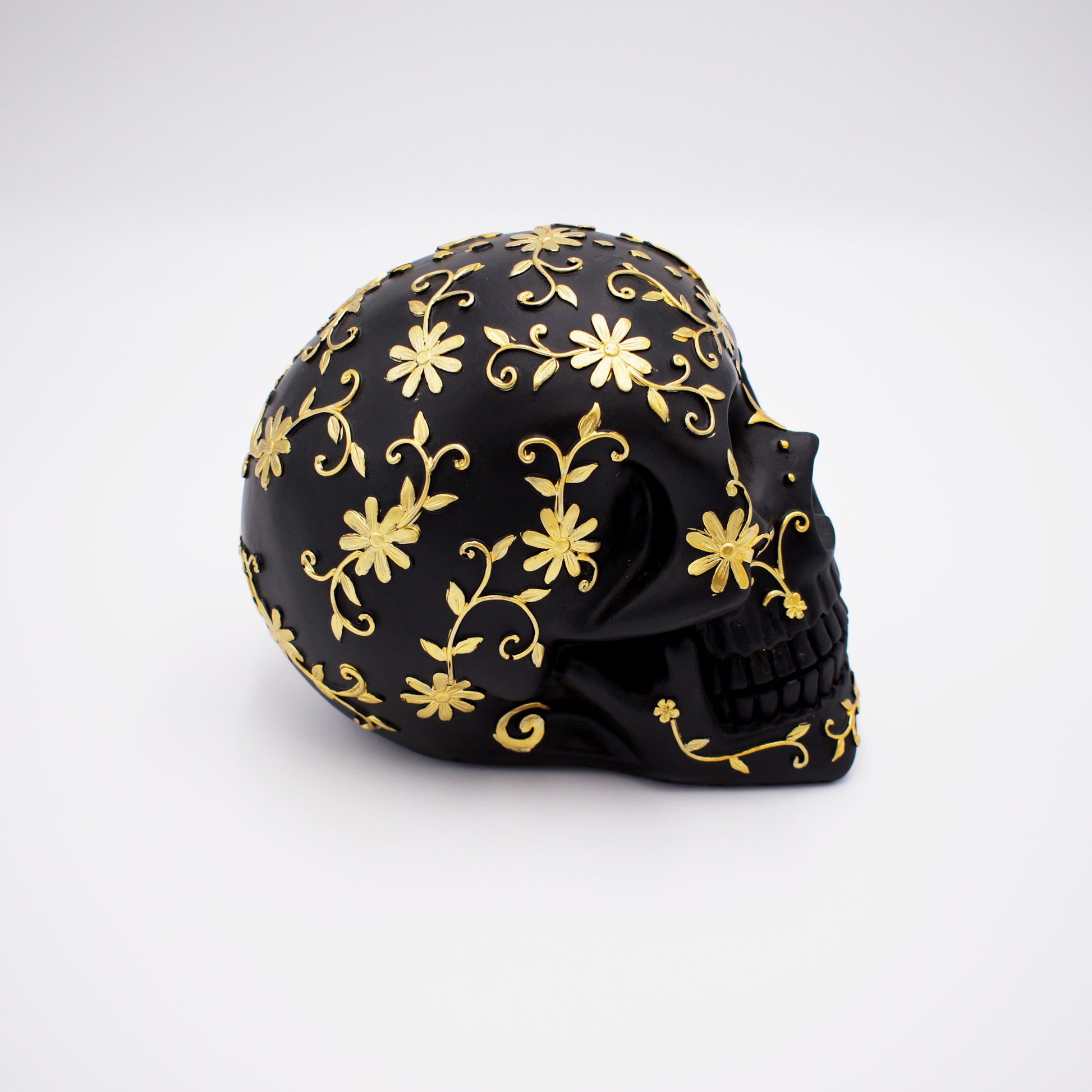 This Black Skull with Gold Floral Design Sculpture merges memento mori symbolism with botanical artistry, creating a sophisticated decorative piece that challenges conventional aesthetics. The skull form serves as a canvas for intricate gold floral detailing, establishing a compelling dialogue between mortality and natural beauty. Ideal for collectors who appreciate darkly elegant décor, this sculpture commands attention as a statement piece on shelves, desks, or display cabinets. The contrasting palette of deep black and luminous gold creates visual depth and dimension, while the thoughtful integration of organic motifs softens the skull's traditional associations. Perfect for those seeking to elevate their interior design with meaningful, conversation-starting artwork that transcends typical home décor conventions.