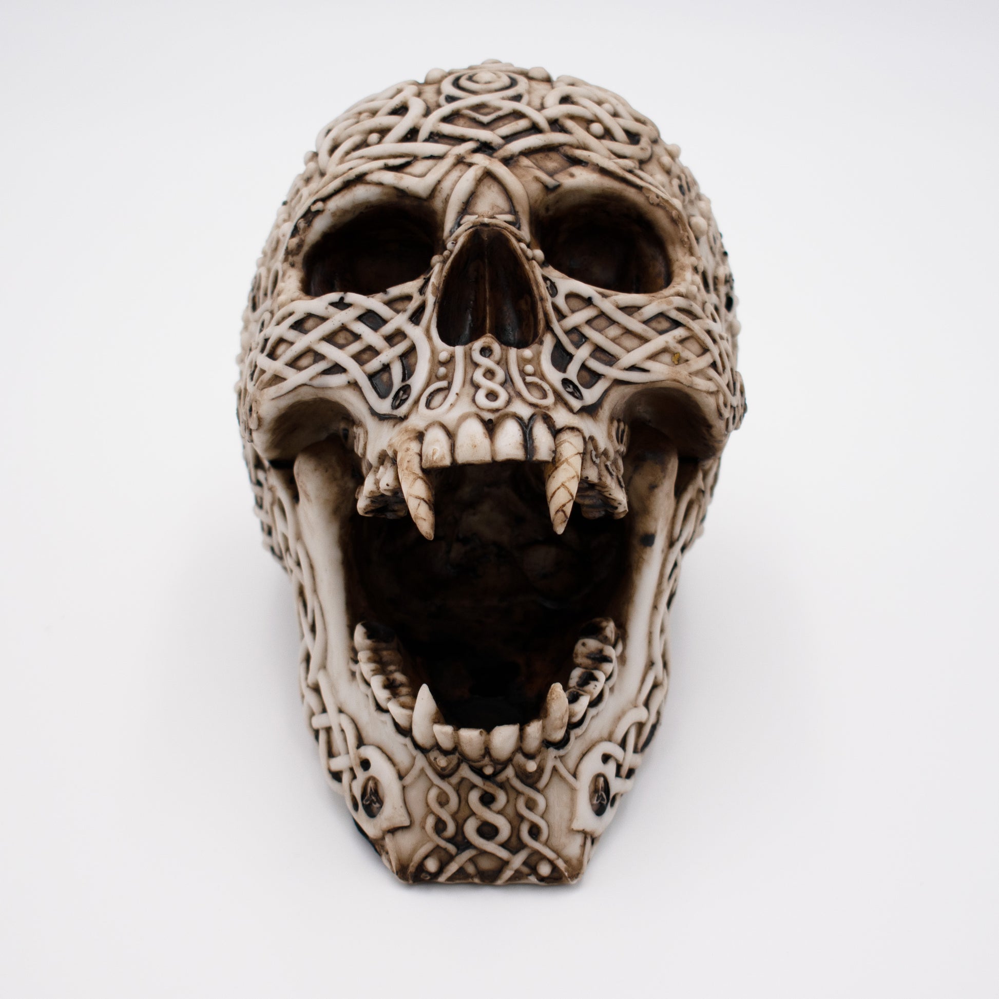 This striking Celtic Vampire Skull Sculpture merges gothic aesthetics with ancient Celtic symbolism, creating a compelling decorative piece for collectors and enthusiasts of dark art. Meticulously crafted with intricate knotwork and traditional Celtic patterns, the sculpture captures the mystique of vampire lore while honoring historical artistic traditions. The detailed bone structure and haunting expression make it an ideal centerpiece for gothic home décor, occult collections, or as a statement piece for those drawn to alternative aesthetics. Perfect for display on shelves, desks, or in dedicated collections, this sculpture serves as both a conversation starter and a testament to skilled artisanal craftsmanship. An exceptional addition for anyone passionate about mythology, Celtic heritage, or darkly elegant design.