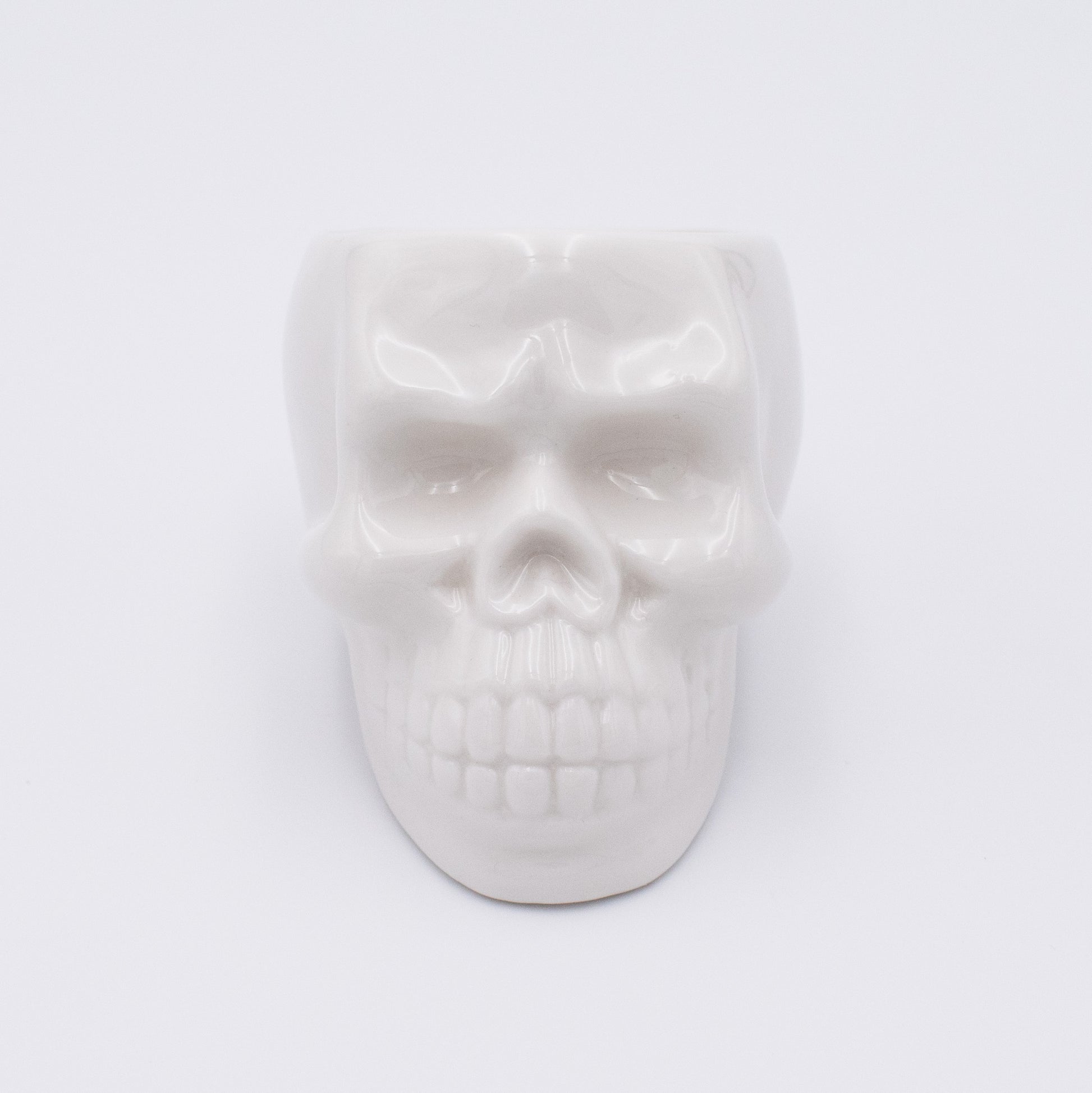 This white ceramic skull container merges functional design with artistic appeal, making it an ideal accent piece for any space. Handcrafted from quality ceramic, the vessel features authentic skull proportions and detailed sculpting that captures anatomical precision. The container is practical storage for small items—jewelry, trinkets, or decorative objects—while the compact size fits seamlessly on shelves, desks, or vanities. The container can double as a small planter as well. The white ceramic finish complements both contemporary and eclectic interiors, offering versatility in styling. Perfect for collectors, design enthusiasts, or anyone seeking a conversation-starting storage solution that balances form and function with understated sophistication.