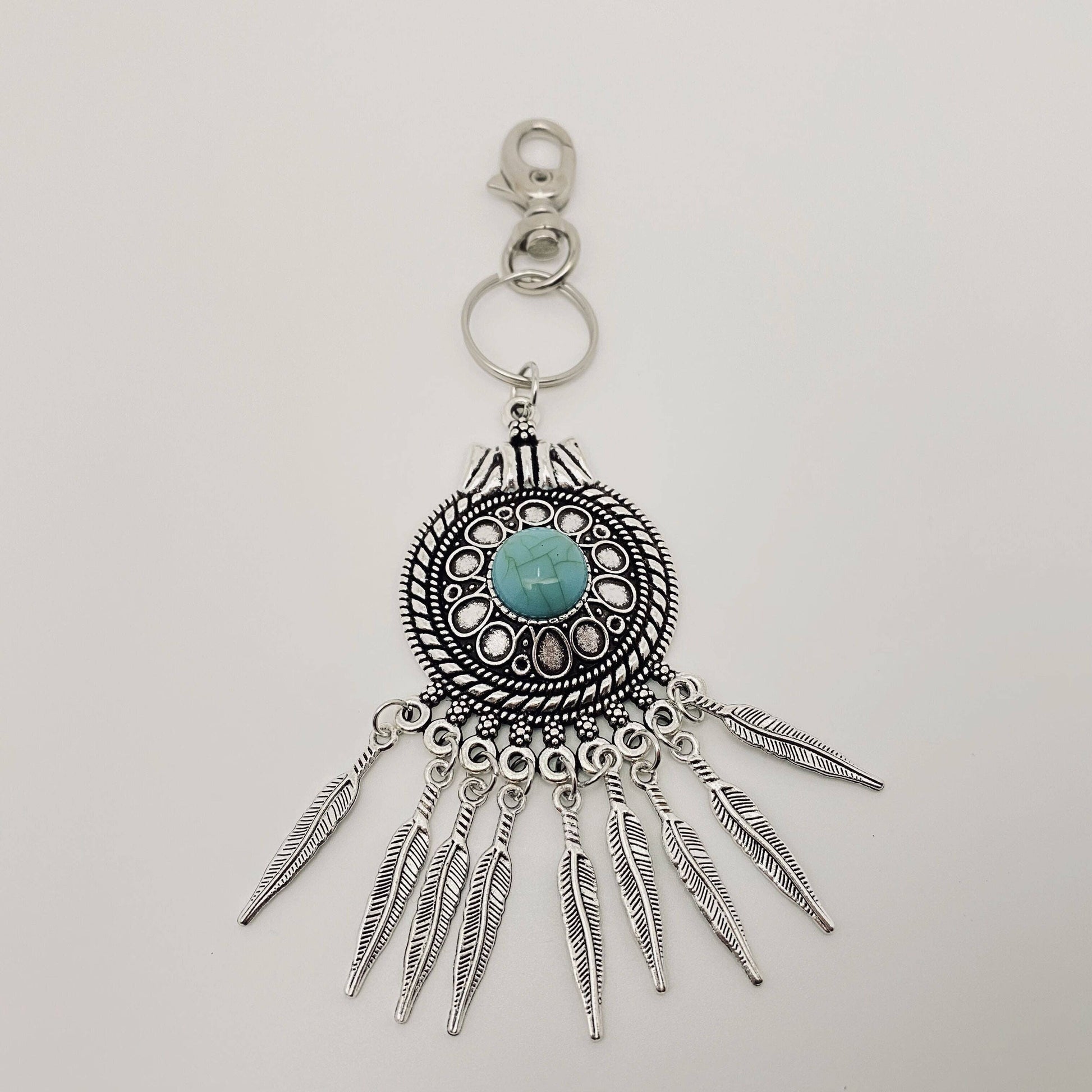 Embodying a Bohemian aesthetic, this leaf tassel keychain pendant features a beautifully detailed design with a faux stone centerpiece that adds an artistic touch to your accessories. Designed for versatility, it serves both as a distinctive keychain and a charming bag ornament. Constructed from hypoallergenic zinc alloy, the piece ensures comfort and safety for those with sensitive skin while offering long-lasting durability. Its lightweight design and elegant craftsmanship make it an ideal accessory to enhance your everyday ensemble with a subtle yet sophisticated flair.