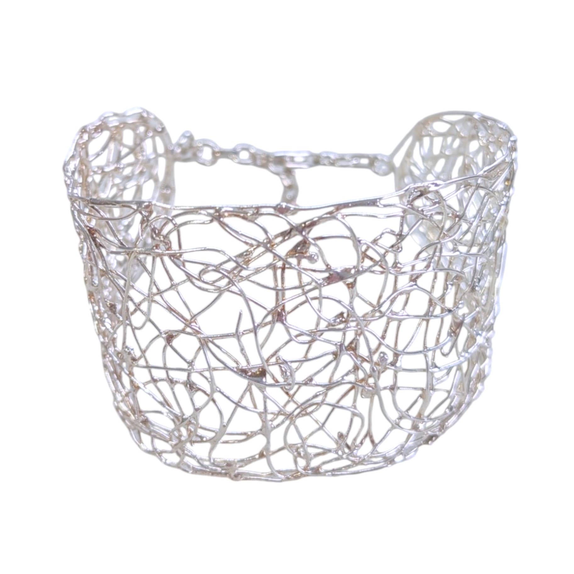 This elegant sterling silver cuff bracelet features a sophisticated woven filament construction that creates dynamic visual interest through its intricate surface texture. The generous proportions make it a commanding presence on the wrist while remaining comfortable for extended wear. Constructed from authentic sterling silver, this piece demonstrates superior craftsmanship with its precisely interlaced design that reflects light in subtle, nuanced ways. The cuff's structured form provides excellent wearability across various occasions, from professional settings to evening events. An investment-quality accessory that combines contemporary design sensibility with the enduring appeal and value of fine silver jewelry.
