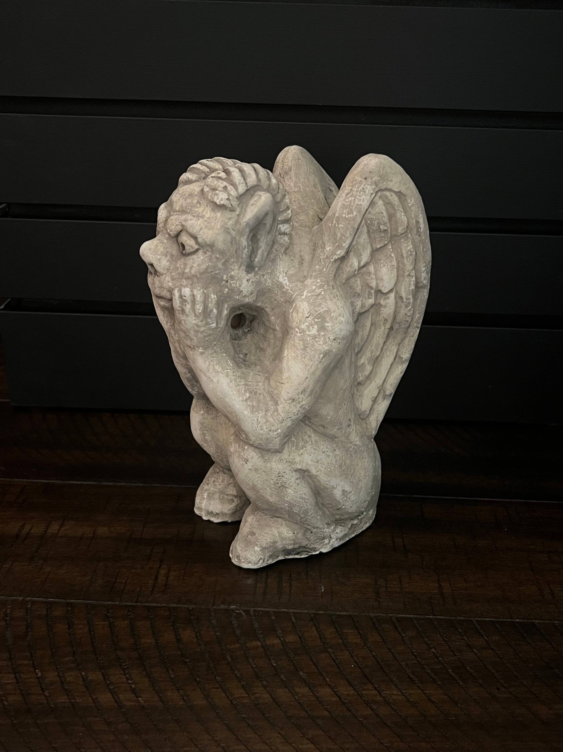 Embrace the captivating essence of Gothic wonder with the Sitting Gargoyle Statue, a handcrafted plaster sculpture that commands attention in any interior or exterior setting. This imposing figure features authentic stone wash finishing—a blend of beige and black weathered tones that evoke aged masonry and timeless craftsmanship. Each piece is individually hand-finished, ensuring subtle color variations that enhance its character and authenticity. Standing 6 inches tall with an 8-inch length and 4-inch width, this gargoyle strikes an ideal balance between statement-making presence and versatile placement. Whether displayed on a shelf, garden ledge, or architectural niche, it introduces an air of mystique and Gothic sophistication to residential or commercial spaces. The durable plaster construction withstands indoor environments and sheltered outdoor settings, making it a versatile addition to eclectic, Victorian, or contemporary dark aesthetic collections. Proudly made in the U.S.A., this artisanal piece celebrates traditional sculptural techniques while serving as a conversation-starting focal point for collectors and design enthusiasts alike.
