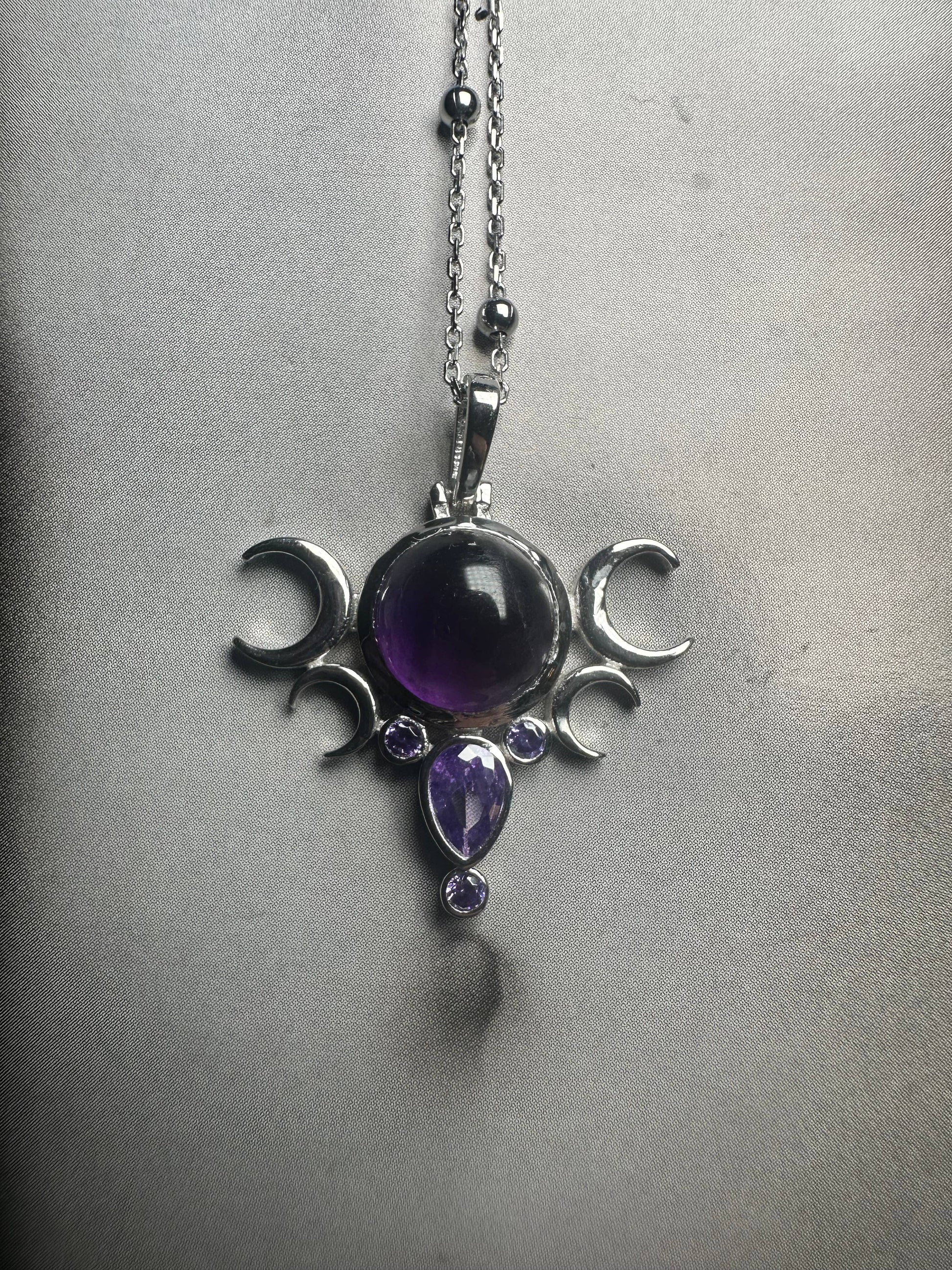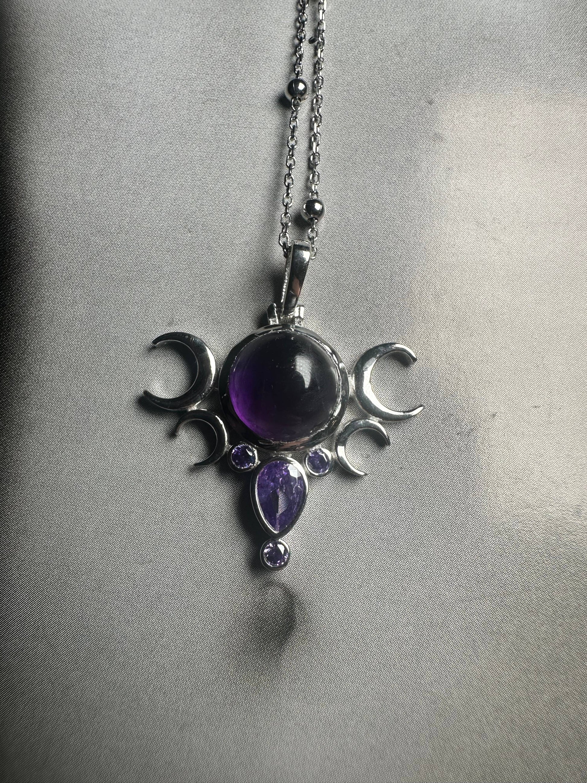 The Sterling Silver Five Moons Amethyst Pendant, paired with a 19.5" sterling silver chain features a genuine Amethyst centerpiece surrounded by the five moon design that symbolizes the moon’s continuous cycle of change, inspiring personal growth and transformation. Inspired by Hecate, the ancient Greek moon goddess linked to magic, wisdom, and protection, this pendant embodies her connection to the cosmic forces. Amethyst, known for its powerful protective qualities, shields against negative energy and spiritual harm, making this necklace not only a stunning piece but also a talisman for purification and safeguarding one’s spirit.